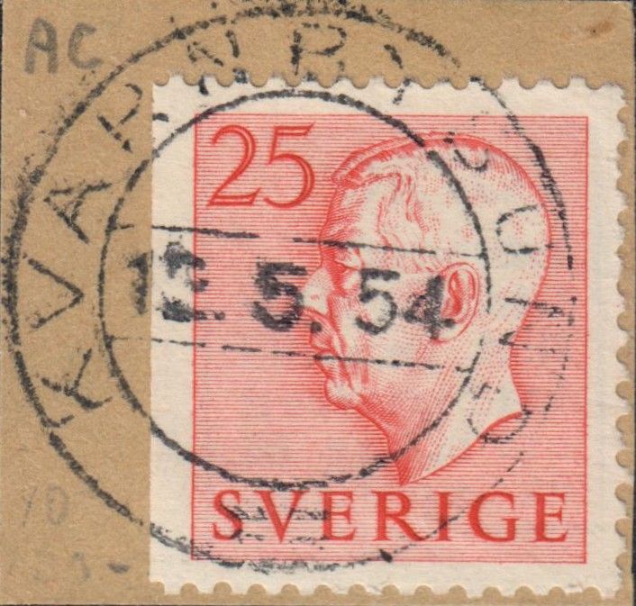 25 öre Gustaf VI Adolf typ I KVARNBYSUND 1954-05-12 praktstämpel på klipp (Nst 58p)Porto tillkommer med 22 kr.