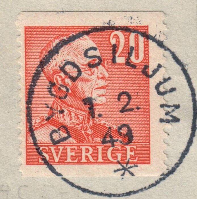 20 öre Gustaf V profil h BYGDSILJUM 1949-02-01 praktstämpel på klipp (Nst 59b)Porto tillkommer med 22 kr.