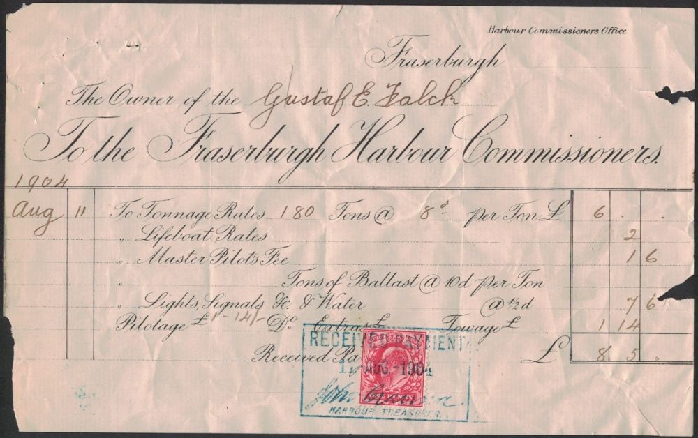 Kvitto gällande hamnavgift(?) 1904 för ångbåten Gustaf E Falck |