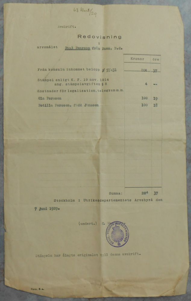 Dokument: Redovisning i arvsmål från 1929 |