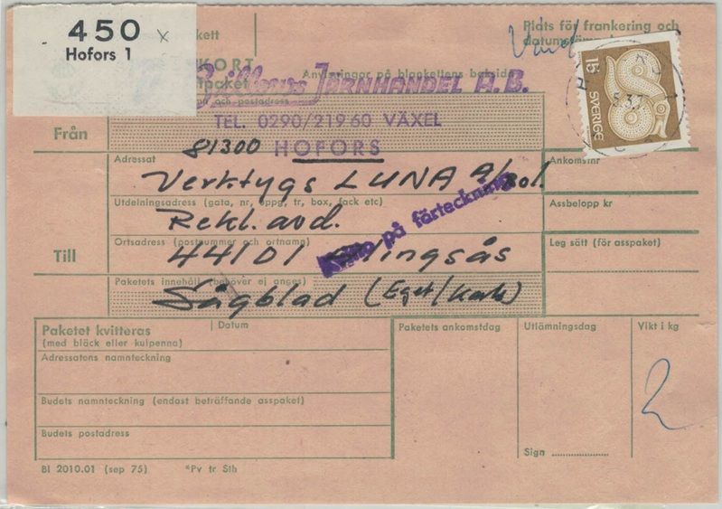Hofors 1 NSt 60 C på paketavi 5.3.77 (Häftesblock baksidan) |