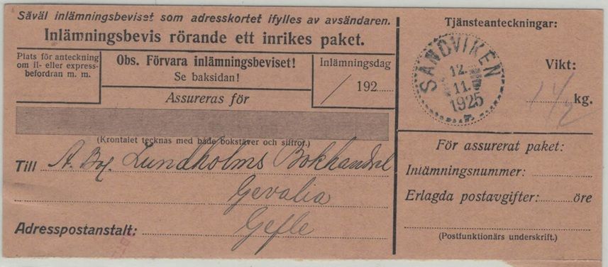 Sandviken NSt 33 på inlämningsbevis 12.11.1925 |