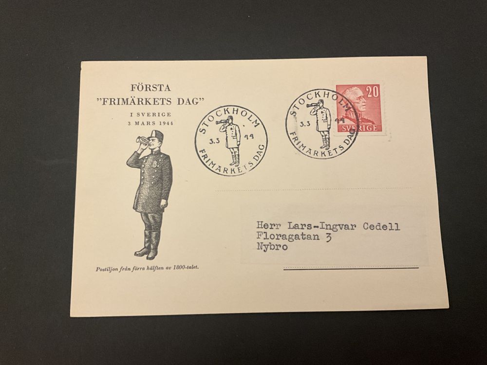 Detta var det första frimärkets dag kort som utgavs.Porto tillkommer med 22 :- inom Sverige.inom övriga Europa 44 :- Samfraktar givetvis vid fler köp. Betalning till bankkonto eller Swish. Avvakta e-mail från mig vid köp.