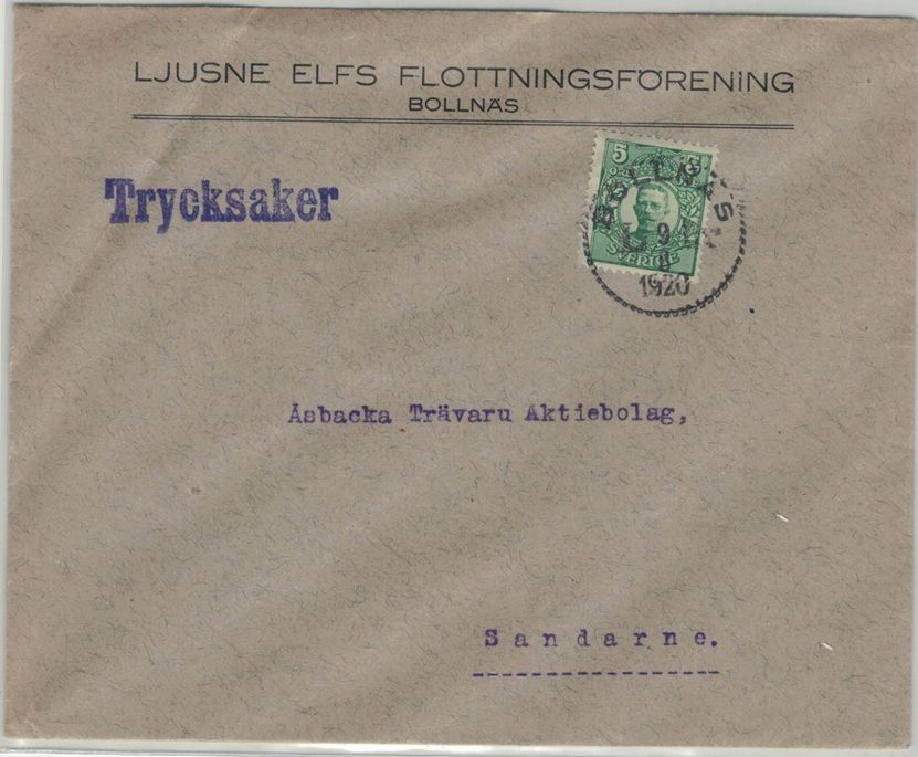 Bollnäs NSt 21 Lbr på brev 9.8.1920 |