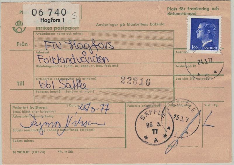 Hagfors 1 NSt 60 C på paketavi 24.3.77 (Häftesblock baksidan) |