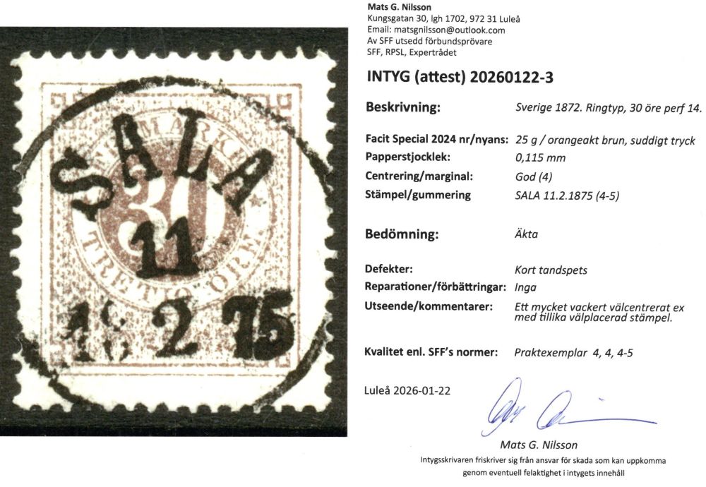 25g Intyg M. Nilsson Sala. Ringtyp tandning 14. 30 öre i PRAKT. U-län |