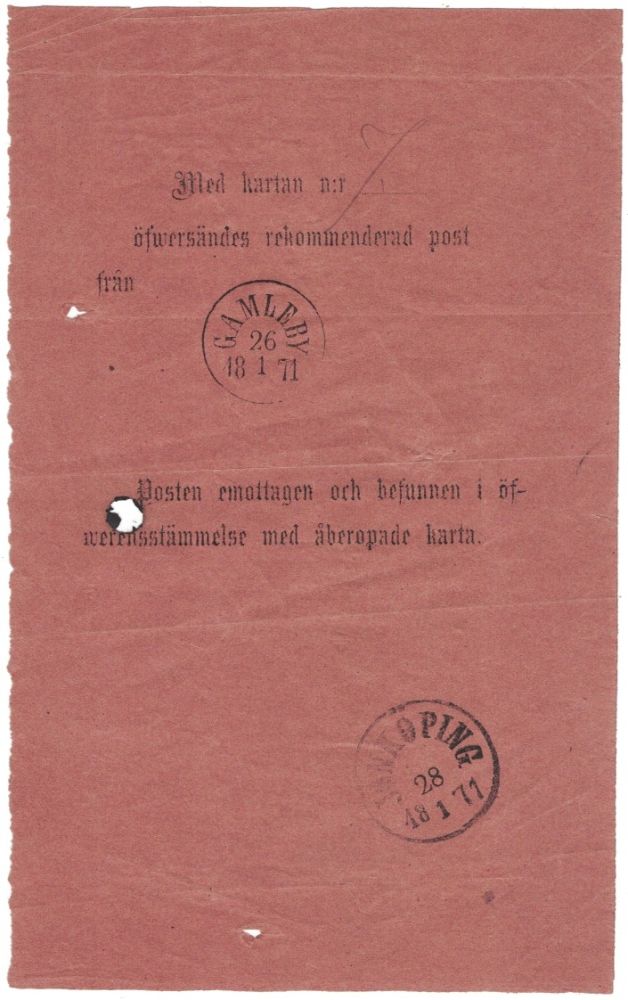 Stämplat ark / kvitto(?) gällande befordran av rekommenderad post 1871 |