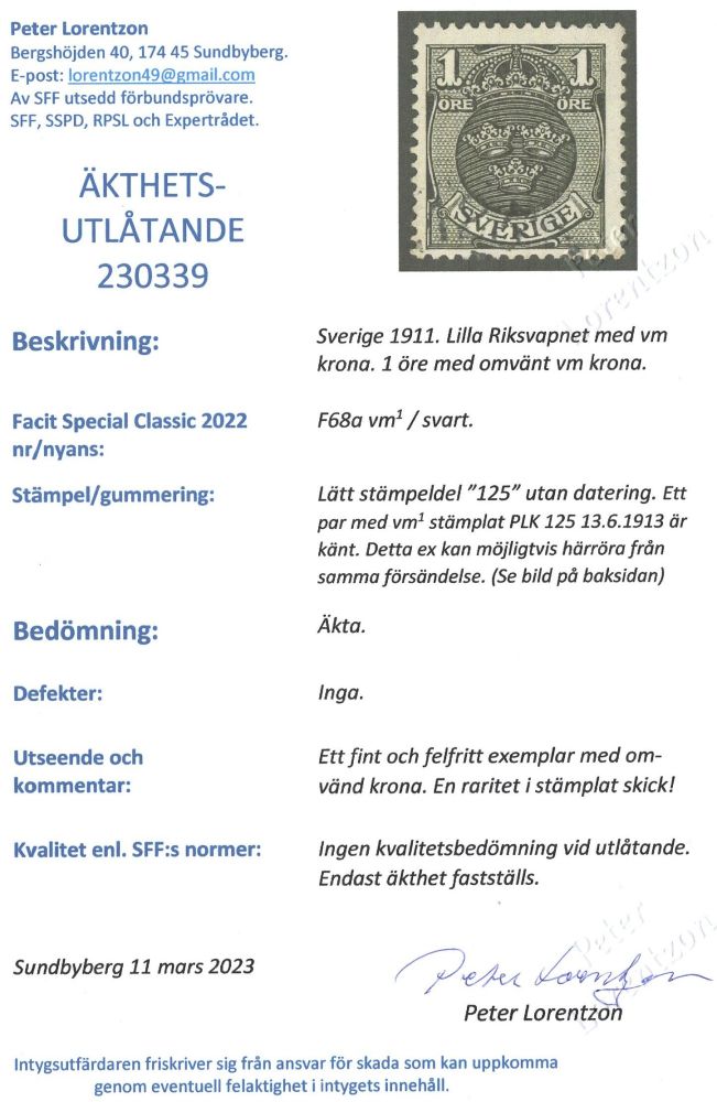 68) omv krona stämplad PLK 125. Lilla riksvapnet. 1 öre svart med stämpel av tiden. Ett par finns med just denna stämpel 13/6 1913 vilket bekräftar att detta märke är från samma ark (även liknande cen |