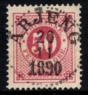 48d Årjeng. Nyanserat P. Lorentzon. Ringtyp med posthorn. 50 öre med LYX-utseende men en vikt hörntand. S-län |