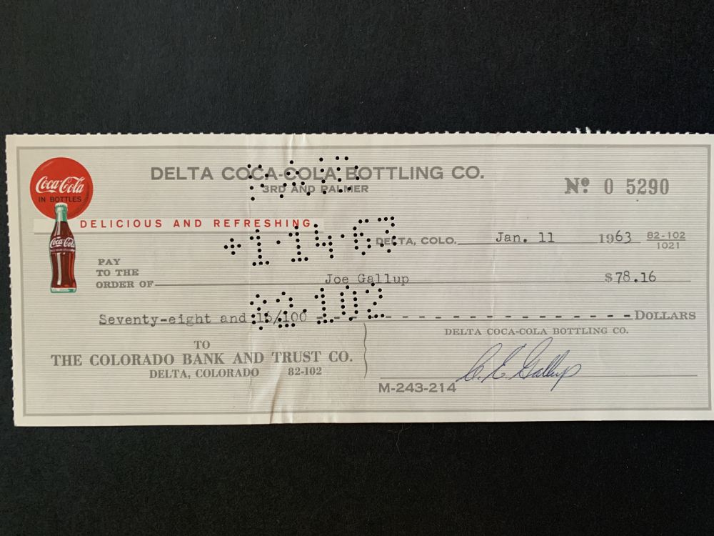 INFODetta är en vintage check från Delta Coca-Cola Bottling Co. daterad 11 januari 1963. Checken är utställd till Joe Gallup för ett belopp av 78,16 dollar. Serienumret är 0 5290.