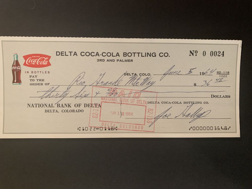 InfoDetta är en check från Delta Coca-Cola Bottling Co. daterad 5 juni 1964. Checken är utställd till Rio Grande McWay för ett belopp av 36 dollar och 48 cent. Serienumret är 0 0024