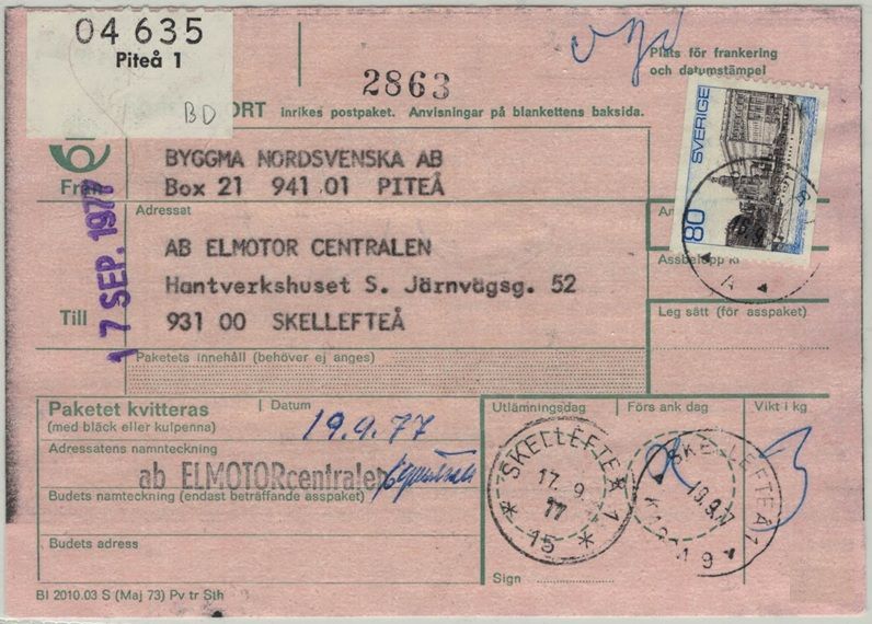 Piteå 1 NSt 60 A på paketavi 16.9.77 |