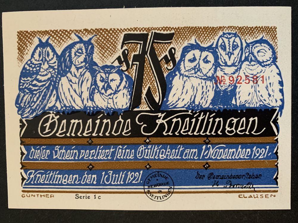 InfoDenna historiska sedel från Gemeinde Kneitlingen är daterad den 1 juli 1921 och förlorade sin giltighet den 1 november 1921. Sedeln har ett serienummer N92581.
