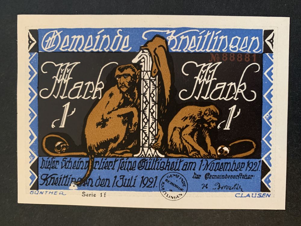 InfoDenna historiska sedel från Kneitlingen är daterad 1 juli 1921 och förlorade sin giltighet den 1 november 1921. Sedeln har ett värde av 1 Mark och serienummer N88881.