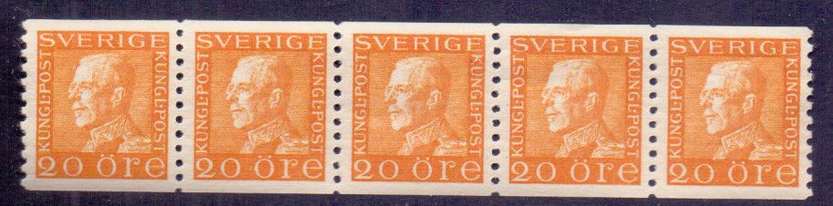 F181 Gustaf V profv, 20 öre, A3, 5-strip ** |