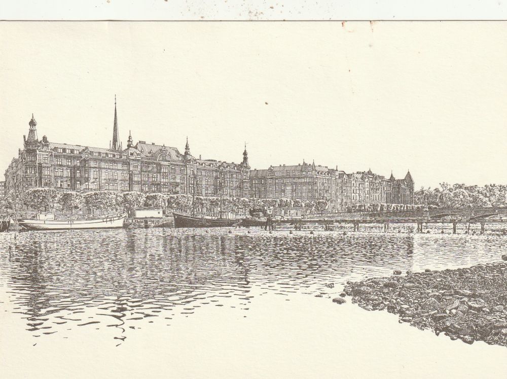 Stockholm, Djurgårdsbron, postgången, efter original litografi av Jan RichertFrakt tillkommer med 22kr för försändelser upp till 50gr.