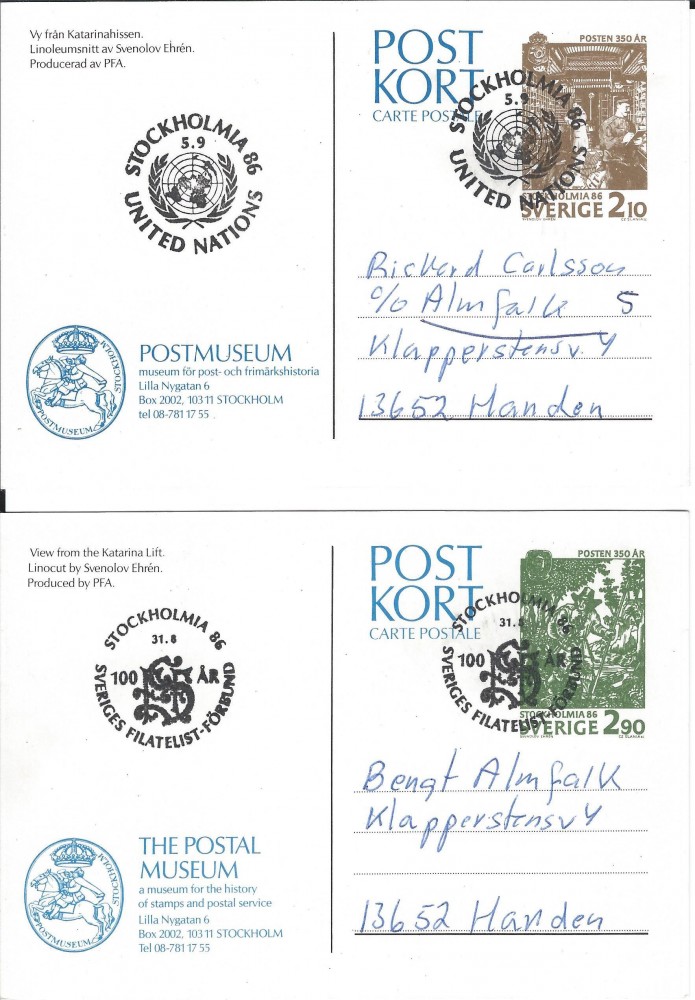 2 stämplade Postkort Stockholmia 1986 |