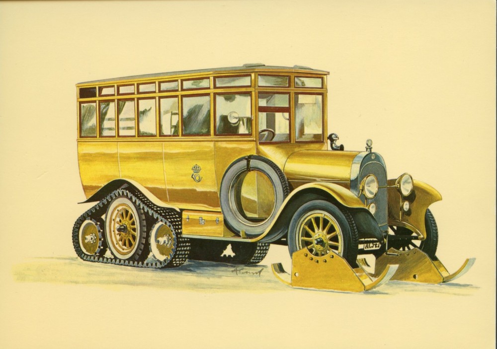 Den första bildilignsen, en Scania-Vabis från 1923, utrustad för vinterkörning |