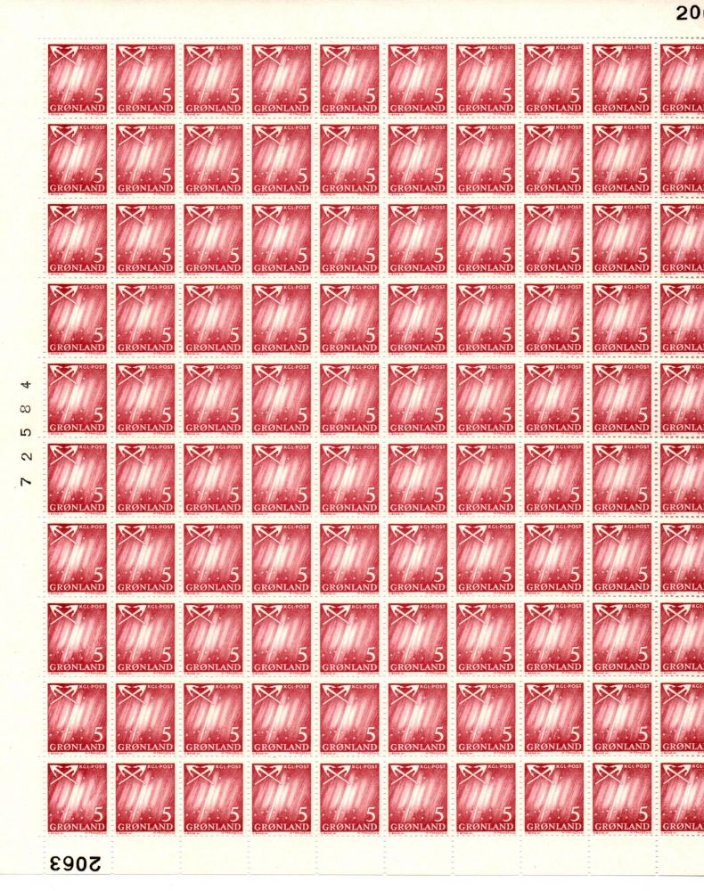 Norrsken, helark. F48 5 öre vinröd.med serie nr och ark nr.