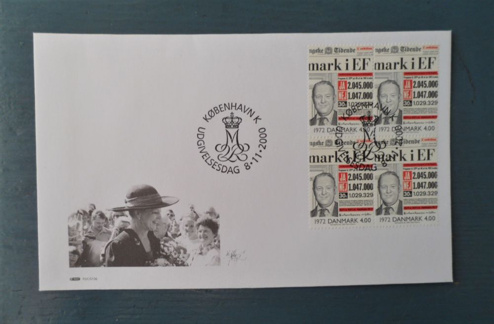FDC Danmark 8 november 2000, Danmark i EF. 4 stk 4,00 kr.För frimärken och mynt tillkommer en avgift på 3 kr per försändelse för att täcka kostnaderna för kuvert / förpackning. Jag använder Post Nord för frakt och deras priser.