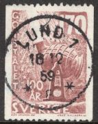 48d Årjeng. Nyanserat P. Lorentzon. Ringtyp med posthorn. 50 öre med LYX-utseende men en vikt hörntand. S-län